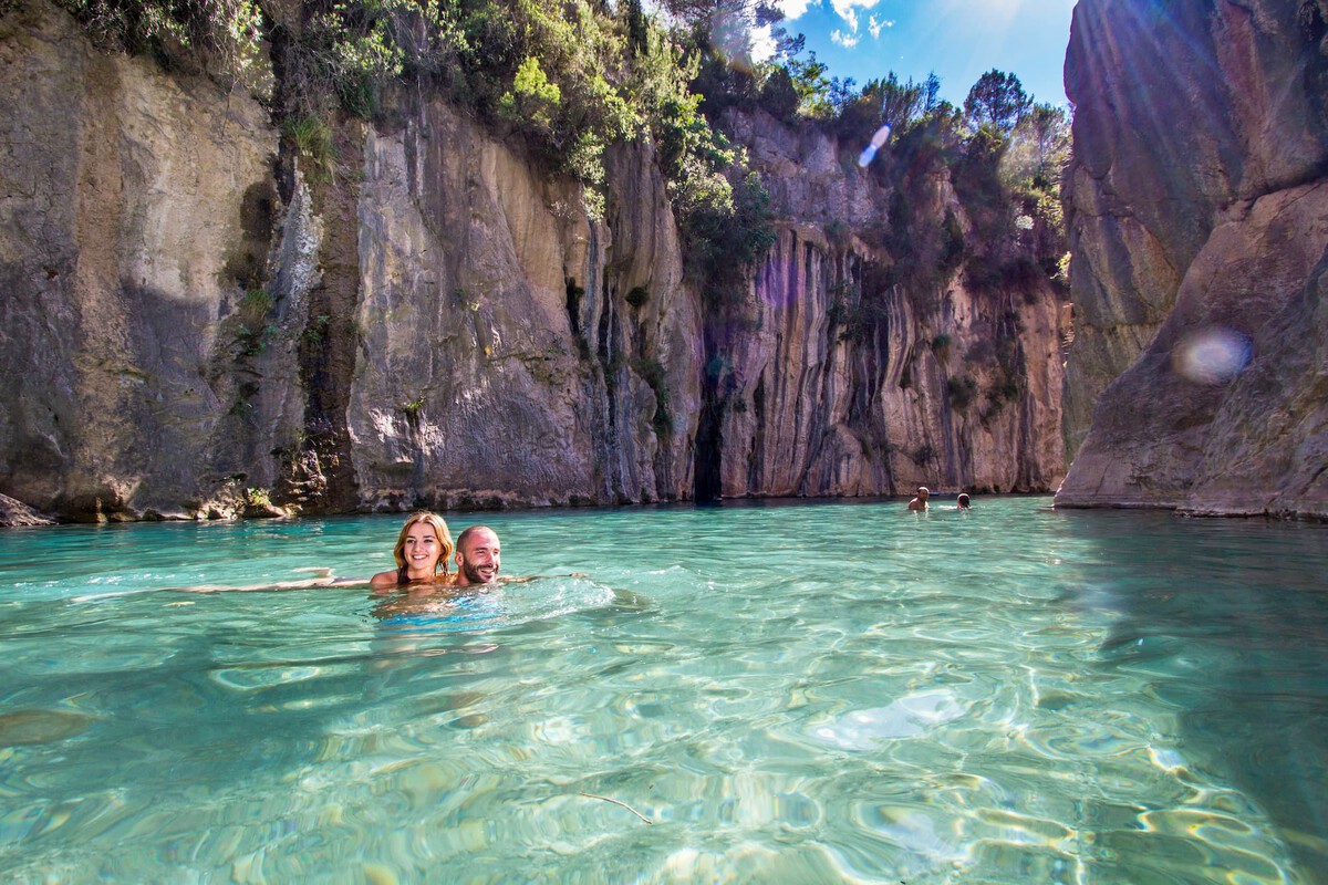 Con una temperatura constante de 25 °C durante todo el año, estas aguas termales son la joya de la corona de Montanejos, en el interior de la provincia de Castellón. Brotan del río Mijares, a 6.000 litros por minuto, y están reconocidas desde 1863 por sus propiedades medicinales. No hace falta ser amante del termalismo ni tener ninguna afección para disfrutarlo: basta con dejarse flotar en esta poza cristalina de tonos verdosos entre las paredes de roca caliza de una garganta natural que se eleva quince metros.