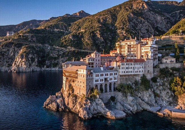 Hablamos del Monte Athos, ubicado en la península Halkidiki al noreste de Grecia. Se trata de un paraje natural intacto bañado por el mar Egeo en el que únicamente viven monjes cristianos ortodoxos. Todo el lugar está repleto de pendientes empinadas, valles exuberantes y manantiales, salpicados de monasterios de colores vivos erigidos sobre la cima de las colinas que desafían por completo las leyes de la gravedad. La mayoría son griegos, pero hay uno ruso y otro serbio.
