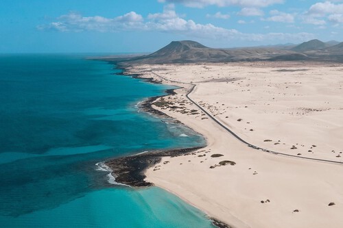 Esta cápsula de paraíso en una carretera con aceras de arena está en el norte de Fuerteventura y atraviesa el paraje natural de las dunas de Corralejo. Se llama FV-104 y, por el camino, recorre varias playas salvajes como El Burro o El Moro hasta llegar al pueblo, dejando a un lado un sistema dunar en constante movimiento que me deja alucinando cada día que paso.