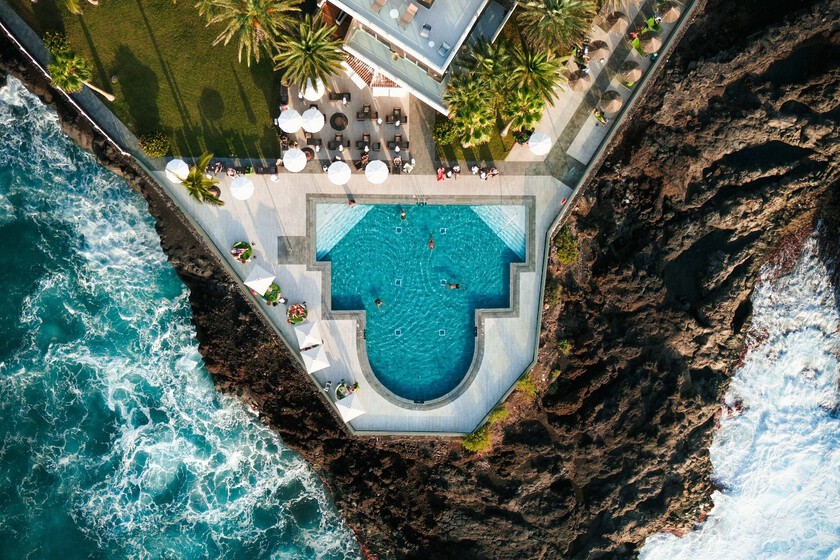 El hotel está construido, literalmente hablando, sobre un acantilado de roca negra volcánica. Incluso hay una cueva debajo que se puede apreciar a la derecha de la foto. El mar es muy fiero en esta zona, con olas enormes que rompen contra la pared de roca y fondos marinos que bailan entre los cobrizos y los turquesas. Un espectáculo que se vuelve dorado al atardecer, porque en este lado de la isla el sol cae sobre el océano.