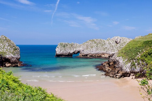 Esta calita de arena fina es un arenal de apenas 40 metros de largo, pero cuando baja la marea ocurre la magia. En pleamar, la playa de Berellín se amplía con bancos de arena ocultos entre las paredes kársticas de los acantilados que la rodean, apareciendo playas diminutas muy diferentes a las que solemos ver en el Cantábrico. Ojo, cuando suba la marea volverán a quedar bajo el mar.