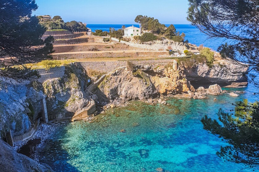 Todo el pueblo desciende hasta la magnífica cala de Banyalbufar, una preciosa bahía de roca con una enorme pared de piedra, por la que a veces cae una cascada. Allí abajo está el puerto del pueblo y una playita donde locales y visitantes disfrutar de un baño cuando el buen tiempo así lo permite. Y, cuando no, de mirar el mar.