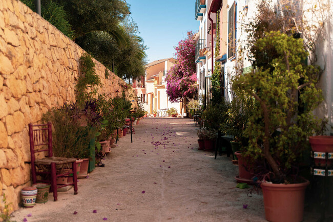 Finestrat es un encantador pueblo de Alicante que se encuentra, literalmente hablando, colgado de la Montaña Puigcampana, con casas colgadas y calles estrechas repletas de cuestas, jardines y rincones decorados con azulejos. Al menos su casco antiguo, que se separa de su zona costera por unos 15 minutos en coche.