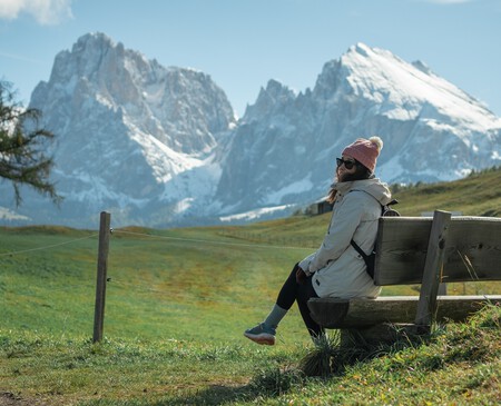 Una de las caminatas clave de este viaje es la de Alpe di Siusi. Se trata de un prado enorme salpicado de granjas que recuerda al fondo de Windows, con las montañas nevadas al fondo. Es una ruta circular de 10 kilómetros sin demasiado desnivel, excepto cuando vas acercándote al refugio a medio camino: el Hotel-Berggasthof Monte Piz. Ahí las cuestas se incrementan, pero merece la pena solo por el chocolate caliente que sirven en su terraza.