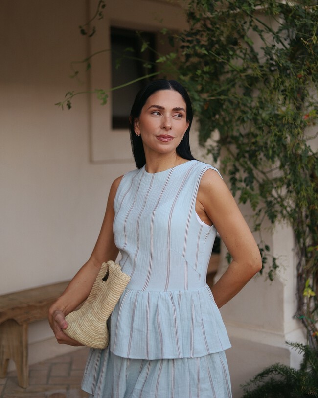 Un vestido camisero es una de las apuestas más cómodas y fresquitas cuando comienza el calor. Este diseño azul de manga corta fruncida y cinturón de Roberto Verino, queda ideal con las sandalias topo y brillantes, una combinación sobresaliente para llevar un look cómodo y estiloso.